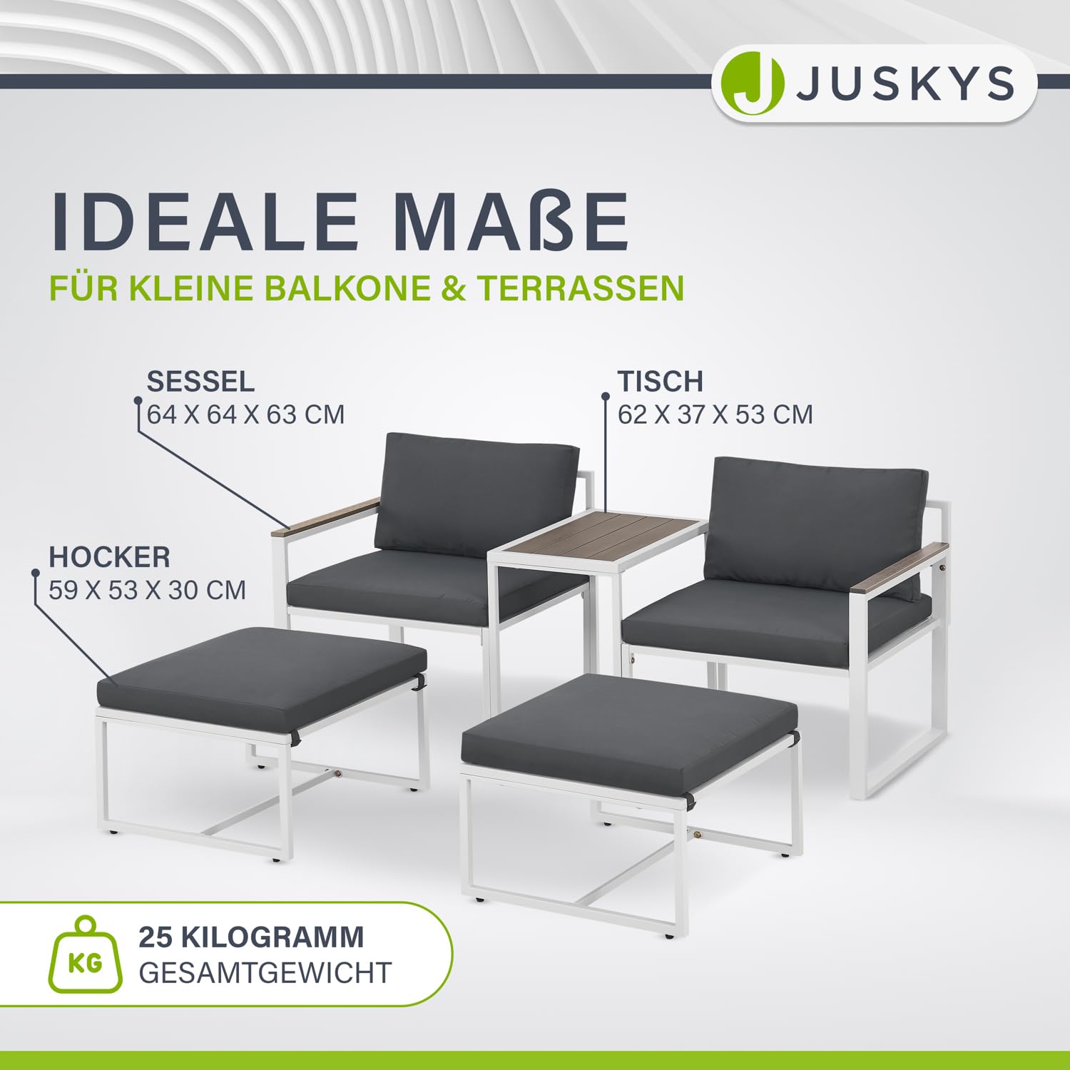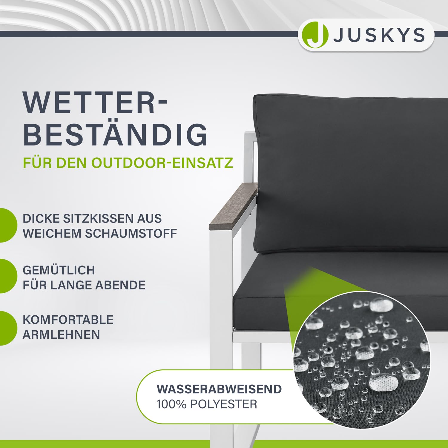 - ✅ Modernes Design für außen: Das weiße Gestell in Kombi mit den grauen Kissen macht die Lounge zum Blickfang; Tischplatte und Armlehnen in natürlicher Holzoptik aus Polywood runden das Gesamtbild ab