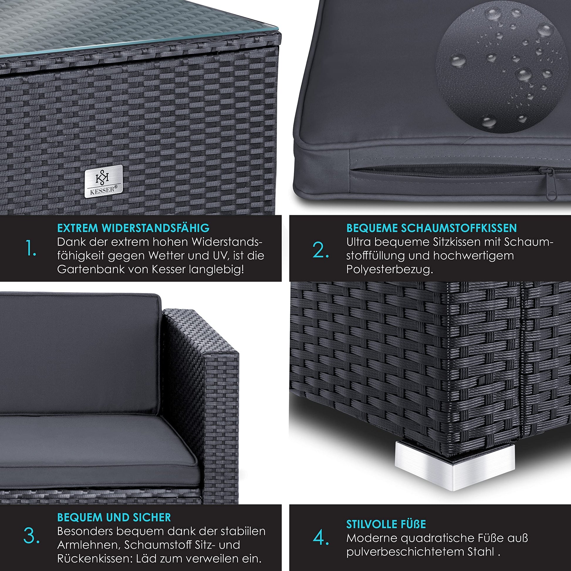 • 𝟒𝐄𝐑 𝐒𝐄𝐓: Die Sitzlandschaft ist durch das moderne Design, bestehend aus vier Teilen ein Highlight in Ihrem Zuhause. Ein gemütliches 3er Sofa sorgt für genügend Platz für Freunde und Familie, dank dem Hocker können Sie die Sitzecke einfach verlängern oder nach einem harten Arbeitstag die Füße hochlegen. In dem gemütlichen Sessel können Sie sich entspannt zurücklehnen und die Sonne tanken. Snacks und kühle Getränke finden auf dem quadratischen Beistelltisch genügend Platz.