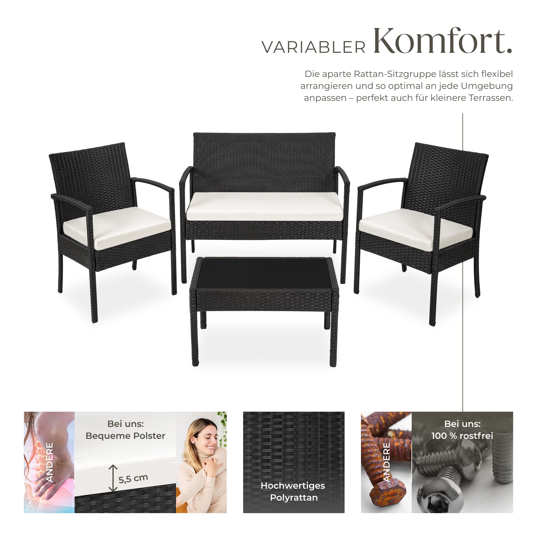 tectake® Polyrattan Gartenmöbel Set – 4-teilig mit 2 Sesseln, 1 Bank & Tisch, Wetterfeste Outdoor Lounge für Garten, Terrasse & Balkon – Schwarz