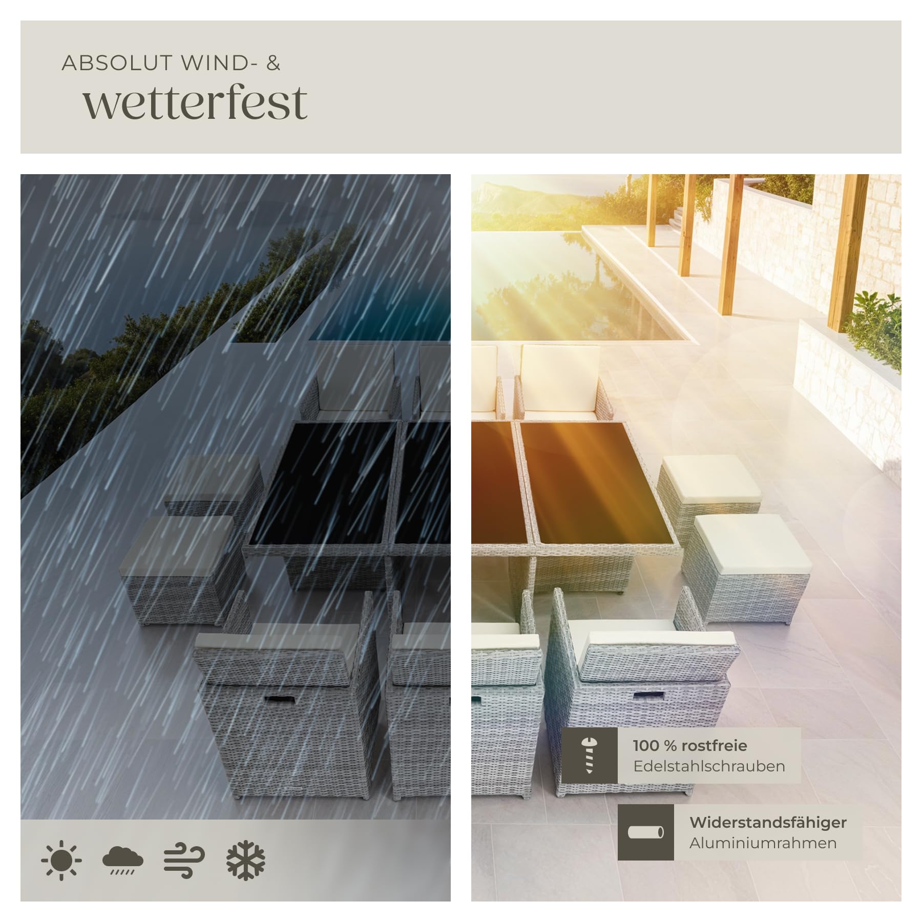 - LEICHT ZU PFLEGEN, IMMER STILVOLL: Unsere Sitzgruppe outdoor ist nicht nur schön, sondern auch extrem pflegeleicht! Mit rostfreien Edelstahlschrauben und einem robusten Aluminiumgestell ist das Set widerstandsfähig und durch die inklusive Schutzhülle optimal gegen Witterungseinflüsse geschützt.